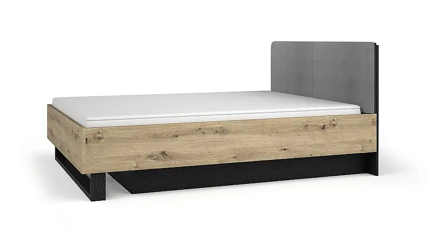 Doppelbett / Gästebett mit gepolsterten Kopfteil Galatsi 04, Farbe: Schwarz mit Holzstruktur / Eiche Artisan, ABS-Kantenschutz, Liegefläche: 160 x 200 cm