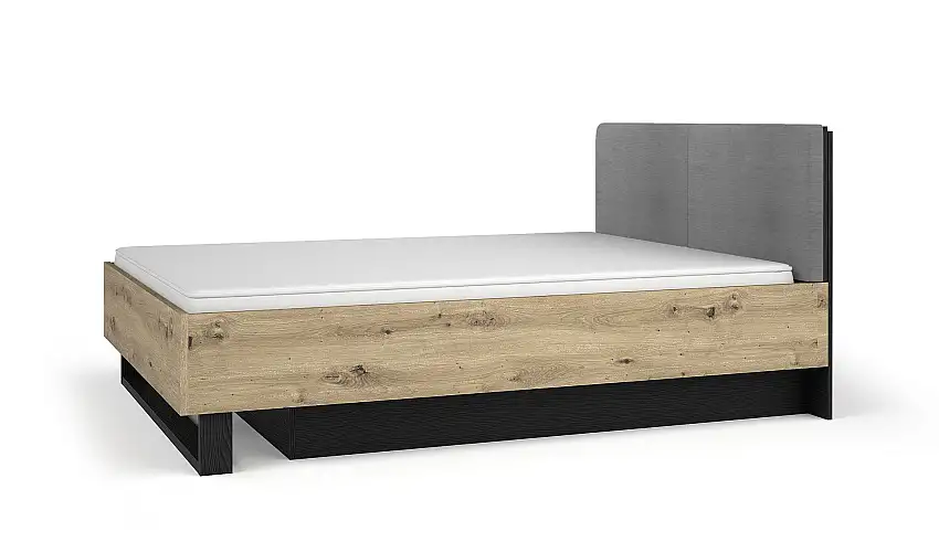 • Doppelbett / Gästebett mit gepolsterten Kopfteil Galatsi 04, Farbe: Schwarz mit Holzstruktur / Eiche Artisan, ABS-Kantenschutz, Liegefläche: 160 x 200 cm