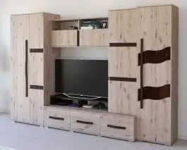 3 Meter breiter Wandschrank / Drehtürenschrank | Craft Grau / Braun | 2 Türen | 21 Fächer | 203 x 300 x 52 cm |Griffe: braun | 1 Kleiderstange