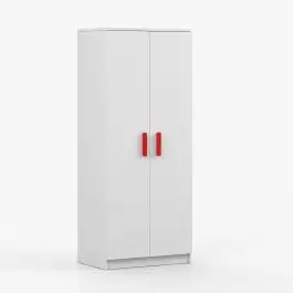 Drehtürenschrank / Kleiderschrank | 192 x 80 x 50 cm | Weiß | Smolikas 69 | 2 Türen | Kleiderstange | rote Holzgriffe | 5 Fächer | viel Ablagefläche
