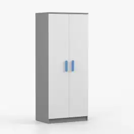 Drehtürenschrank / Kleiderschrank | 192 x 80 x 50 cm | Weiß / Grau | Smolikas 59 | 2 Türen | eine Kleiderstange | 5 Fächer | blaue Holzgriffe