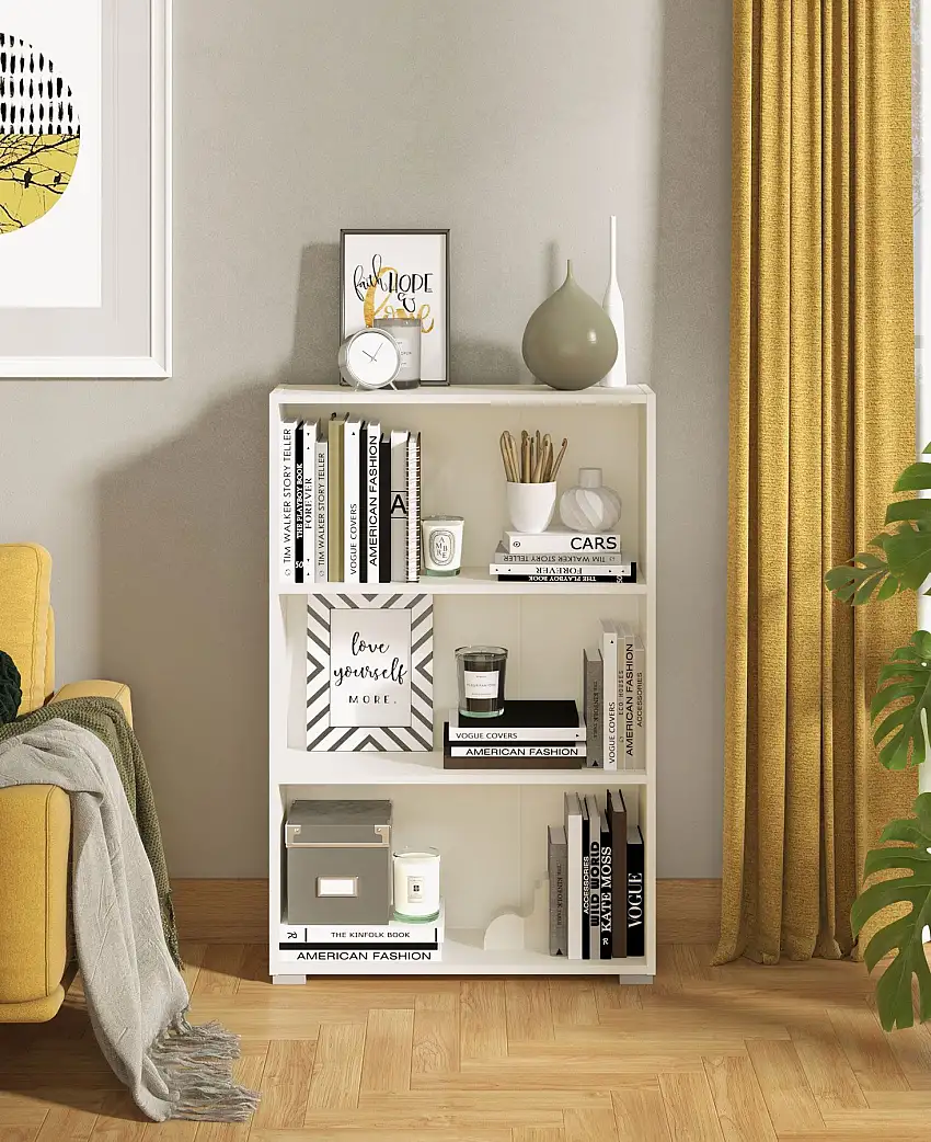 • Regal mit drei Fächer Knide 01, Farbe: Weiß, Bücherregal, schlichtes Design, ABS-Kantenschutz, Maße: 107,5 x 70 x 24,5 cm, gut kombinierbar
