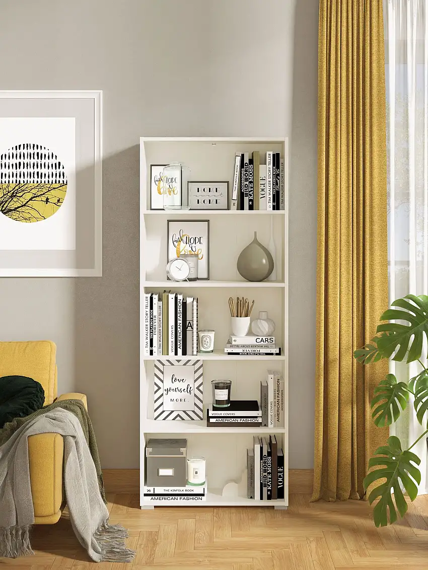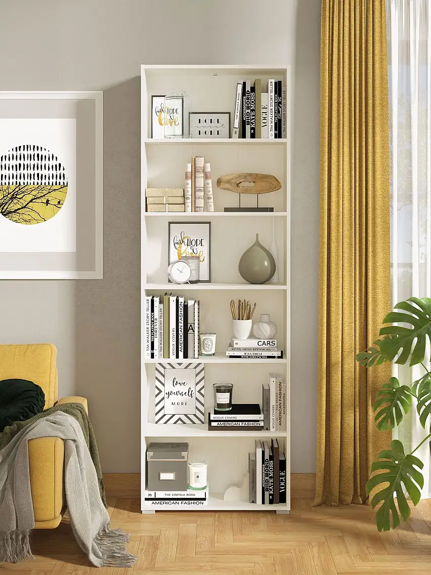 • Hohes Regal Knide 09, Farbe: Weiß, fünf Fächer, ABS-Kantenschutz, Bücherregal, gut kombinierbar, Maße: 176,5 x 70 x 24,5 cm, schlichtes Design