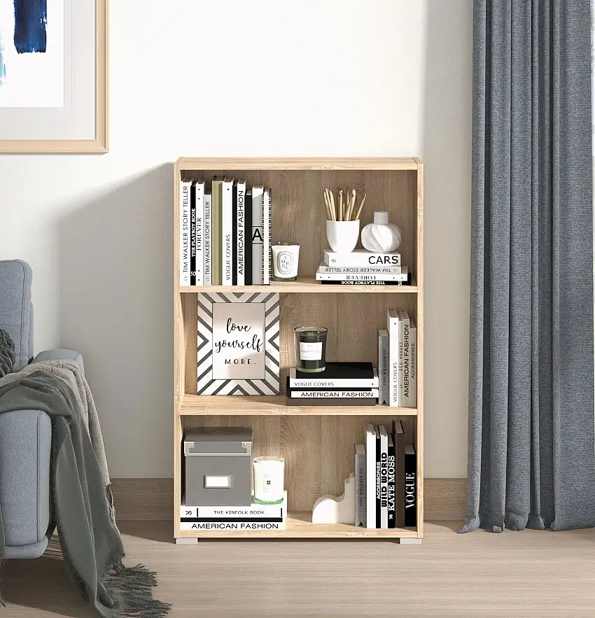 • Regal Knide 04, Farbe: Eiche Sonoma, drei Fächer, ABS-Kantenschutz, stabil, Bücherregal, Maße: 107,5 x 70 x 24,5 cm, für Wohnzimmer