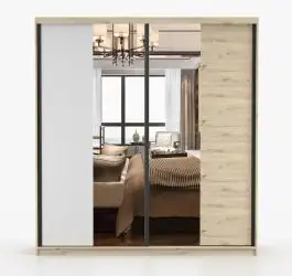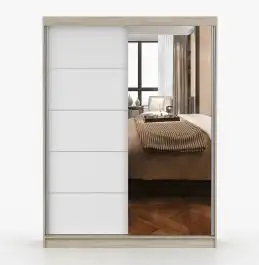 Kleiderschrank / Schiebetürenschrank | Weiß / Sonoma Eiche | Bucegi 19 | mit Spiegel | 2 Türen | Griffe: Aluminium | 200 x 150 x 61 | 6 Fächer