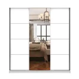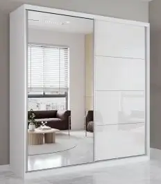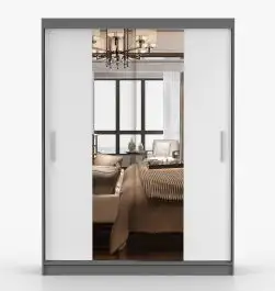 Kleiderschrank / Schiebetürenschrank | Weiß / Grau | Bucegi 03 | mit Spiegel | 2 Türen | Griffe Aluminium | 200 x 150 x 61 cm | Kleiderstange