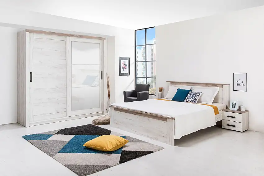 • Schlafzimmer Komplett - Set B Zemun, 4-teilig, Farbe: Eiche Grau / Eiche Weiß, ein Schiebetürenschrank mit einer Spiegeltür, ein Doppelbett und zwei Nachtkommoden, ABS-Kanten
