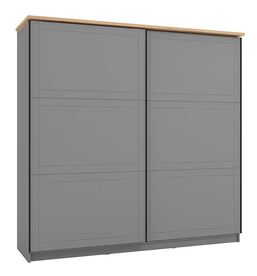 Aktion!Schlichter Schwebetürenschrank Banat 12, 2,2 Meter breit, Farbe: Graphitgrau / Eiche Artisan, zwei Kleiderstangen, Griffe: Metall, Maße: 214 x 220 x 63,5 cm