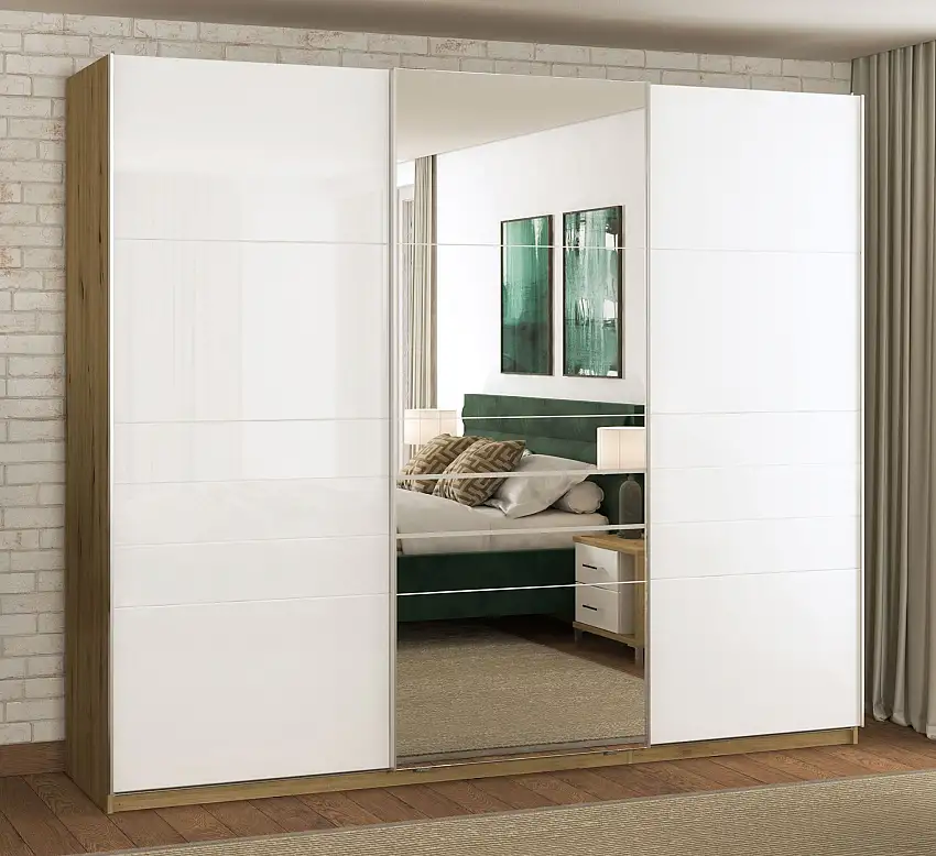 Schwebetürenschrank mit drei Türen Palanka 03, zwei Kleiderstangen, eine Spiegeltür, Farbe: Weiß Hochglanz / Eiche Artisan, Maße: 224 x 262,5 x 65,5 cm