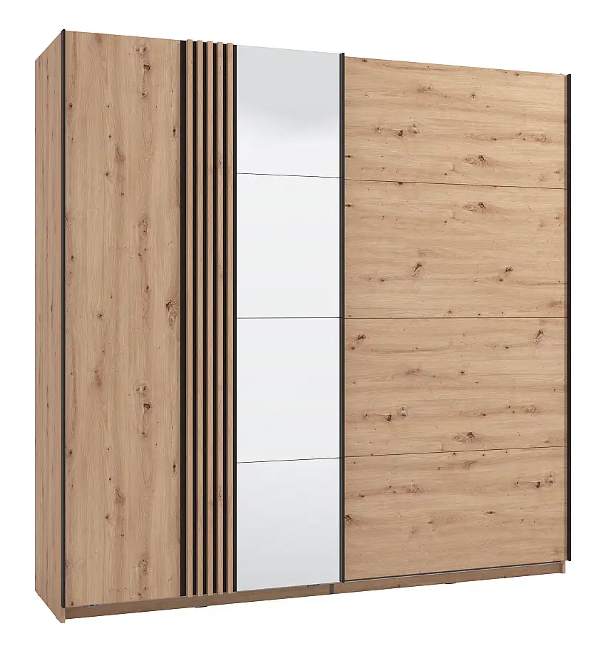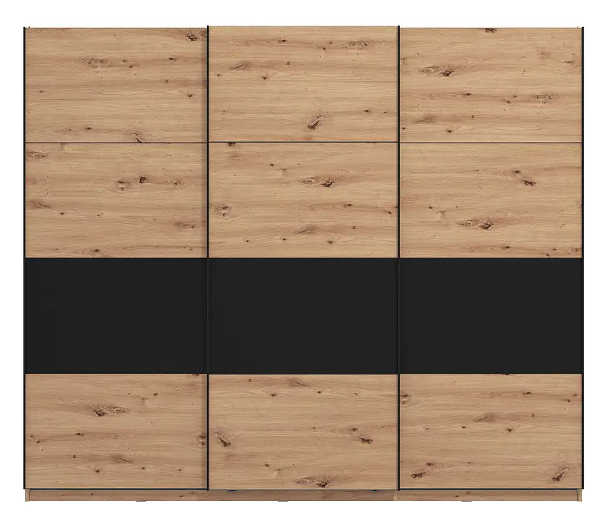 Schwebetürenschrank / Kleiderschrank Crina 11, Farbe: Eiche Artisan / Schwarz, zwei Kleiderstangen, ABS-Kanten, Maße: 224 x 262,5 x 65,5 cm