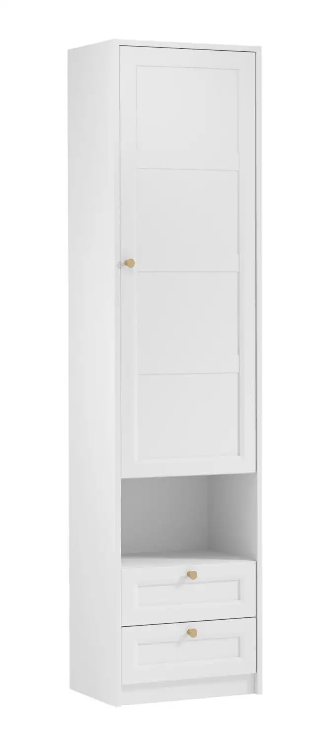 • Weißer Schrank Ersigen 08 mit Metallgriffen in Gold, 219 x 54 x 40 cm, mit 1 Tür und 2 Schubladen, ABS Kantenschutz, 5 Fächer