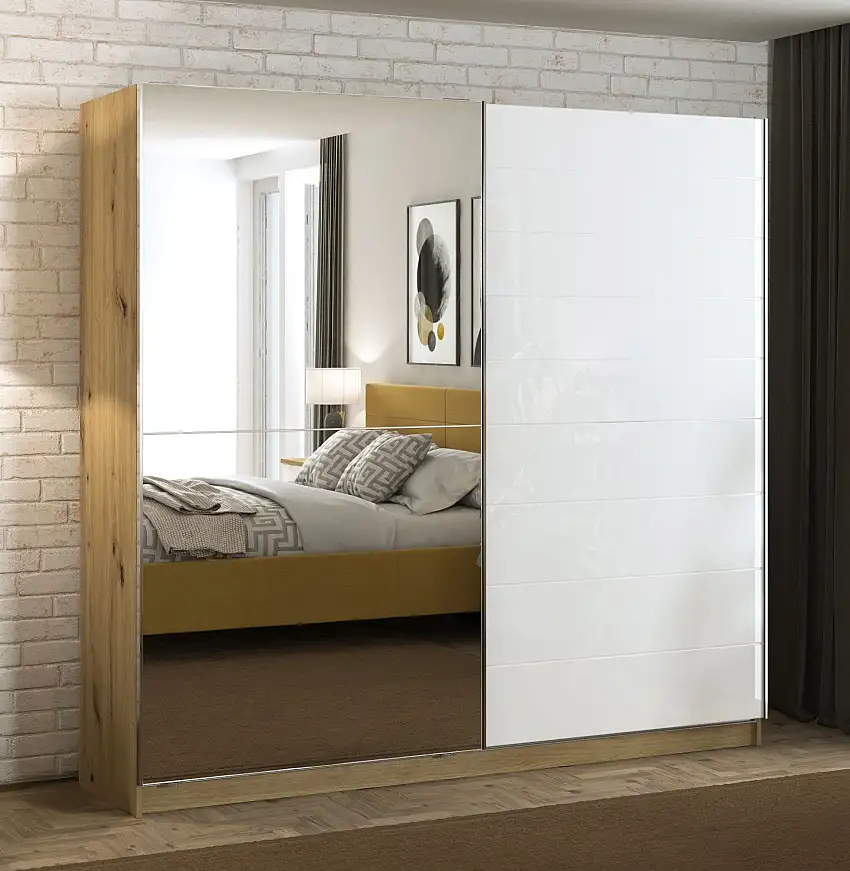 • Zweitüriger Schwebetürenschrank mit einer Spiegeltür Palanka 06, Farbe: Weiß Hochglanz / Eiche Artisan, zwei Kleiderstangen, 10 Fächer, Maße: 210 x 217 x 62,5 cm