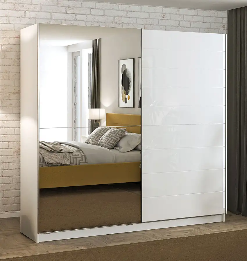 • Zweitüriger Schiebetürenschrank mit einem Spiegel Palanka 01, Farbe: Weiß / Weiß Hochglanz, zwei Kleiderstangen, 10 Fächer, Maße: 210 x 217 x 62,5 cm