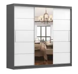 2,3 Meter breiter Schiebetürenschrank / Kleiderschrank mit Spiegel Weiß / Grau | Gorski 75 | 218 x 233 x 61 cm | 3 Türen | 12 Fächer | Griffe: Metall