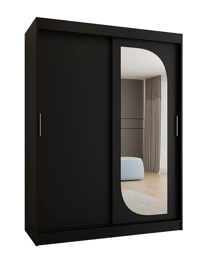 Schiebetürenschrank / Kleiderschrank Signalkuppe 11, Farbe: Schwarz, 1,5 Meter breit, zwei Kleiderstangen, fünf Fächer, eine Spiegeltür