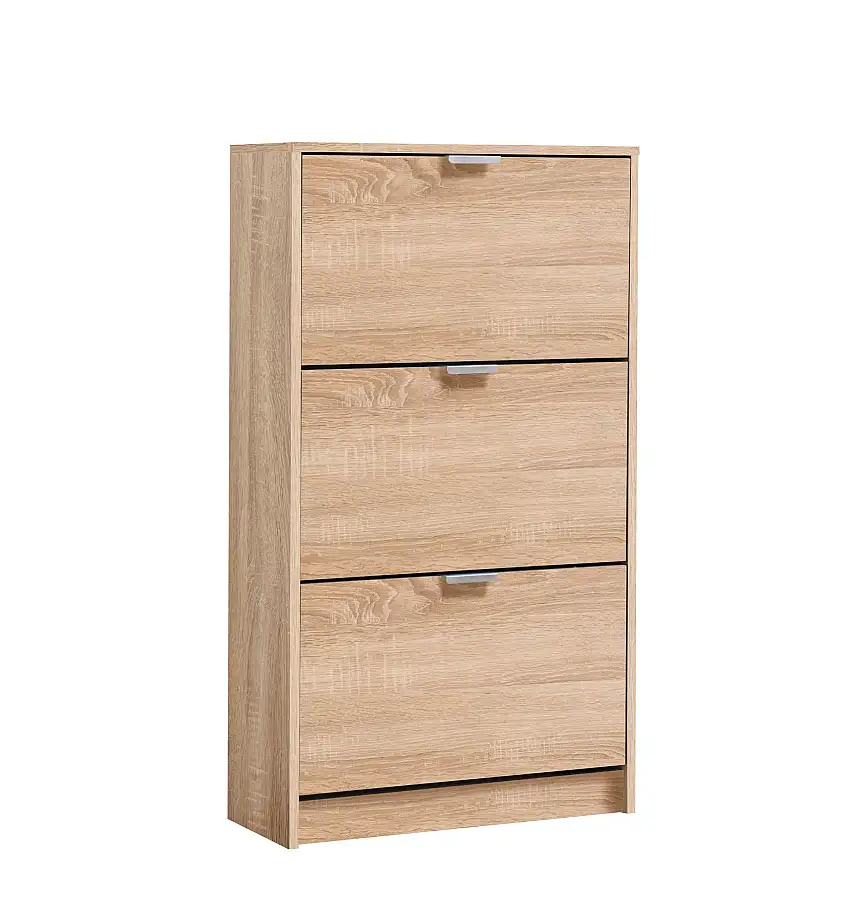 • Schlichter Schuhschrank mit drei Kipptüren Veliko 02, Farbe: Eiche Sonoma, ABS-Kantenschutz, Griffe: Grau, Maße: 119 x 58 x 18 cm, für den Vorraum