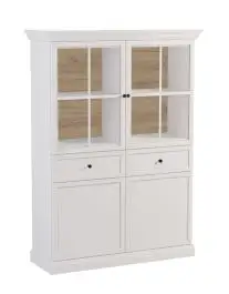 Aktion!Vitrine Torsakala 09 in Weiß Opal, 161 x 114 x 40 cm, 8 Fächer, 4 Einlegeböden, 2 Schubladen, 2 Holztüren, 2 Glastüren, inkl. LED-Beleuchtung, ABS