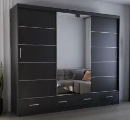 Aktion!2,5 Meter breiter Schiebetürenschrank / Kleiderschrank mit Spiegel Schwarz | Lusatian 30 | 218 x 250 x 61 cm | 3 Türen | 4 Schubladen | 7 Fächer