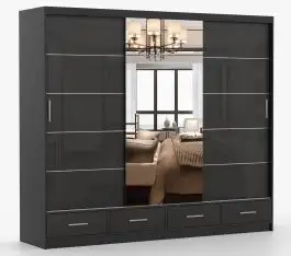 Aktion!2,5 Meter breiter Schiebetürenschrank / Kleiderschrank mit Spiegel Schwarz | Lusatian 39 | 218 x 250 x 61 cm | 3 Türen | 4 Schubladen | 7 Fächer