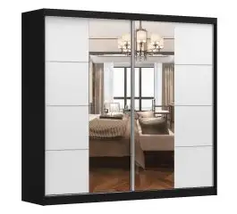 Aktion!2,3 Meter breiter Schiebetürenschrank / Kleiderschrank mit Spiegel Weiß / Schwarz | Gorski 50 | 218 x 233 x 61 cm | 2 Türen | 12 Fächer | eckig