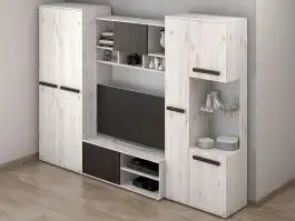 Modernes Wohnzimmer – Set B Banat, 4-teilig, Farbe: Eiche Artisan / Graphitgrau / Grau, ABS-Kantenschutz, zwei Vitrinen, ein TV-Unterschrank und ein Wandregal