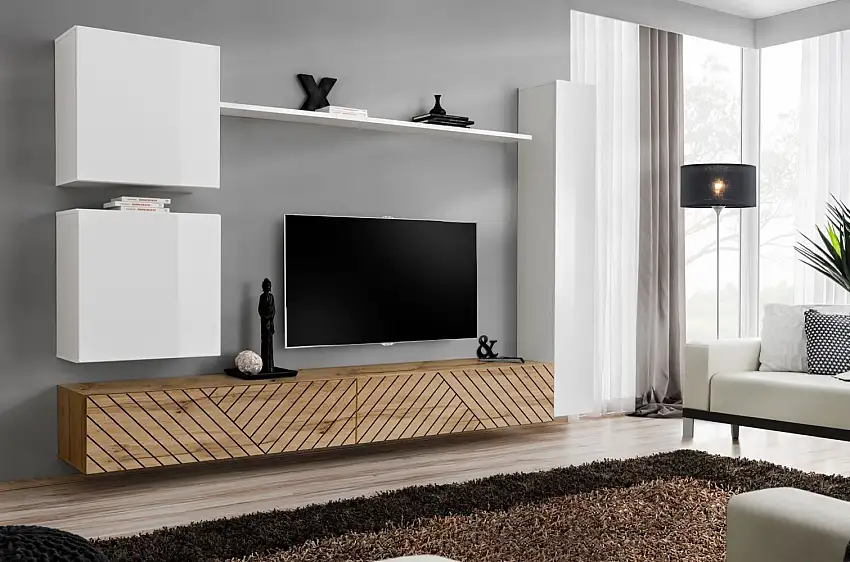 Moderne Wohnwand, Farbe: Weiß Hochglanz / Eiche Wotan – Abmessungen: 180 x 280 x 40 cm (H x B x T), mit Push-to-open System