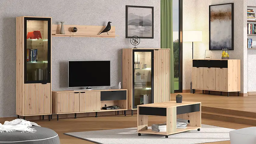 • Modernes Wohnzimmer Komplett - Set B Zvesdara, 6-teilig, in Eiche Artisan / Schwarz, zwei Vitrinen, ein TV-Schrank, ein Wandregal, eine Kommode, ein Couchtisch, ABS-Kanten