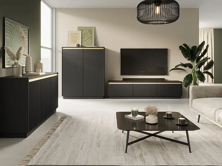 Wohnzimmer – Set A Finghall, 3-teilig, Farbe: Schwarz, Soft-Close-Funktion, ABS-Kantenschutz, ein TV-Unterschrank, ein Highboard und ein Sideboard