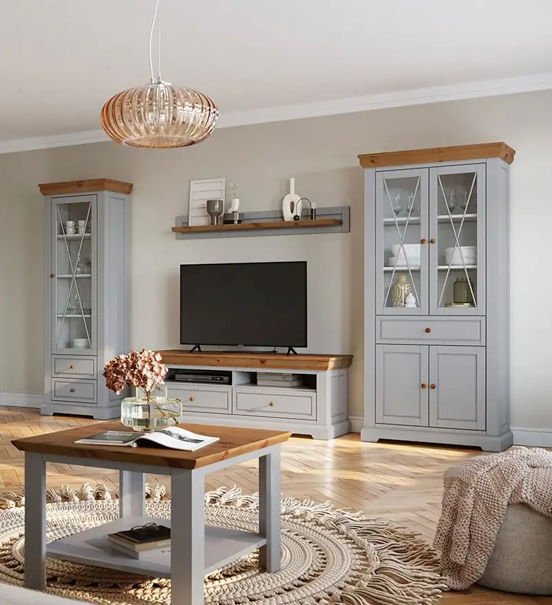 Aktion!Wohnzimmer Komplett – Set B Gimone, 5-teilig, finnische Kiefer, in Grau, Griffe aus Holz, Landhausstil, zwei Vitrinen, ein Wandregal