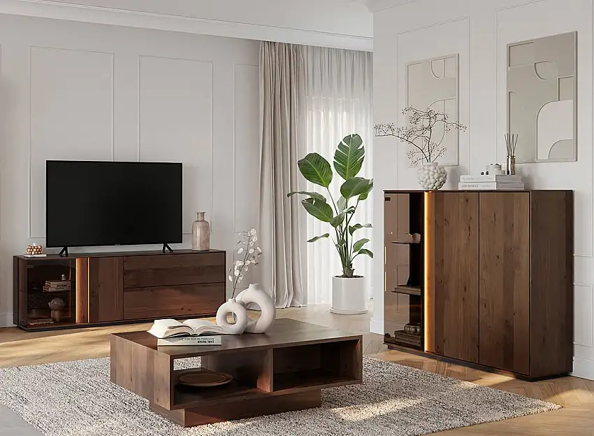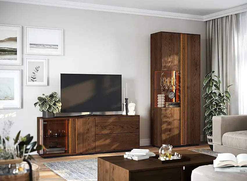 Aktion!Wohnzimmer Komplett – Set C Sienne, 3-teilig, Massivholz Wildeiche, in Tabacco geölt, Push-to-open Funktion, inkl. LED-Beleuchtung, getöntes Glas