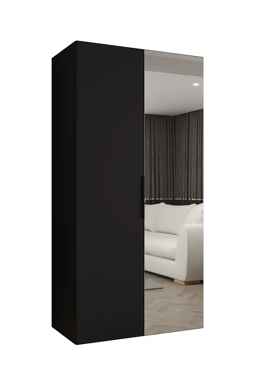 Drehtürenschrank / Kleiderschrank Korab 61, Farbe: Schwarz, eine Spiegeltür, eine Kleiderstange, Griffe: Schwarz, 1 Meter breit, Soft-Close-Funktion