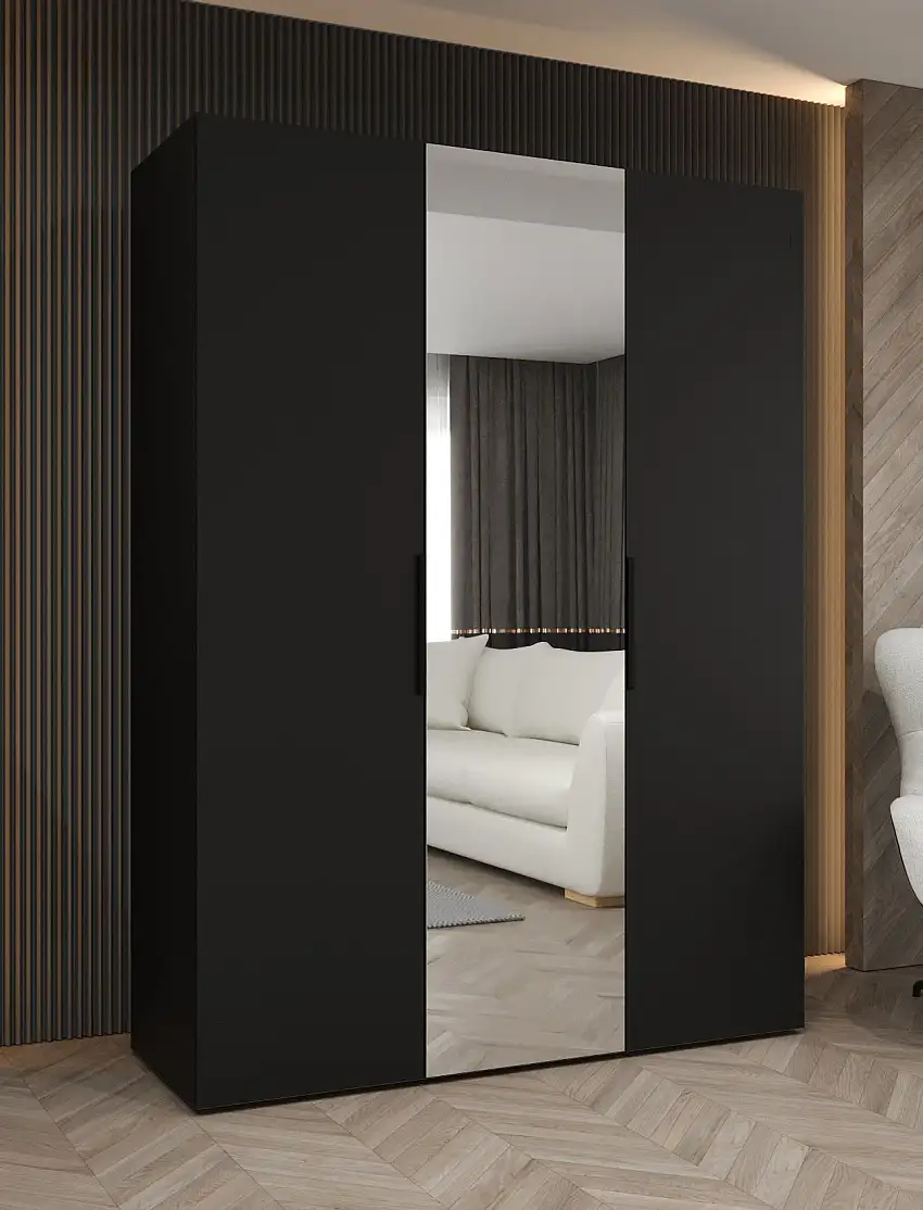 • Drehtürenschrank / Kleiderschrank mit drei Türen Korab 17, Farbe: Schwarz, 1,5 Meter breit, Griffe: Schwarz, zwei Kleiderstangen, Soft-Close-Funktion