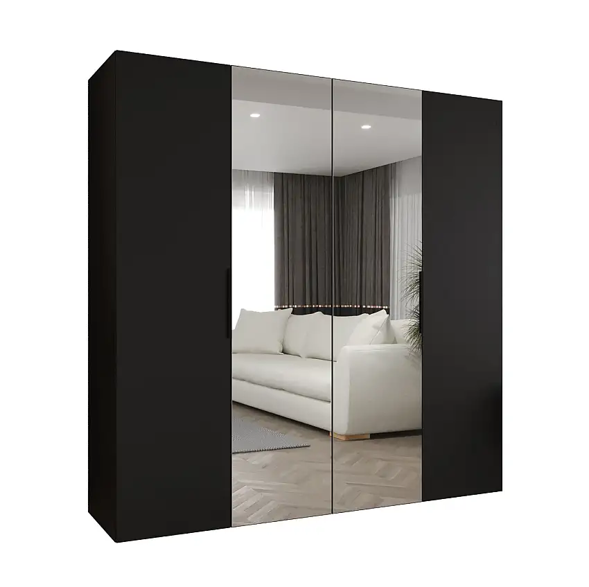 Drehtürenschrank / Kleiderschrank Korab 83, Farbe: Schwarz, zwei Spiegeltüren, zwei Kleiderstangen, Griffe: Schwarz, 2 Meter breit, Soft-Close-Funktion