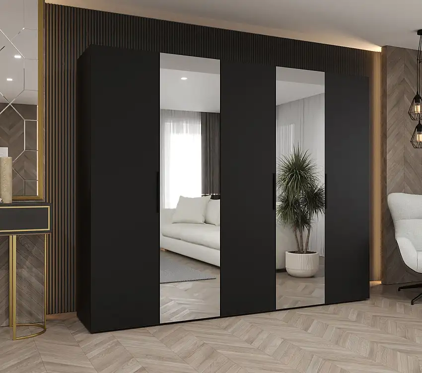Drehtürenschrank / Kleiderschrank Korab 94, Farbe: Schwarz, zwei Spiegeltüren, drei Kleiderstangen, Griffe: Schwarz, 2,5 Meter breit, Soft-Close-Funktion