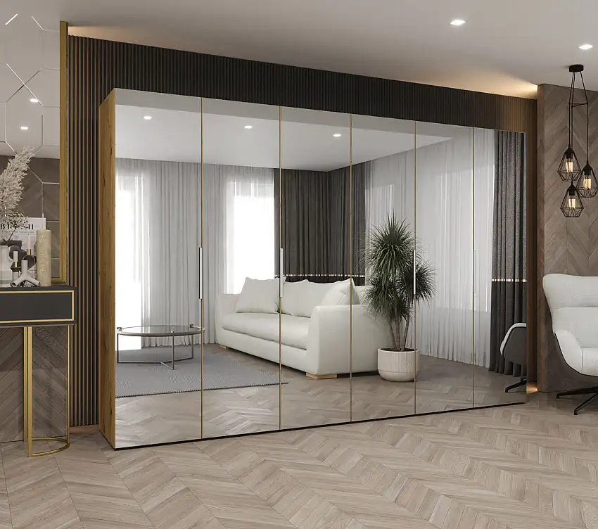 Drehtürenschrank / Kleiderschrank Korab 164, Farbe: Kaschmir, vier Kleiderstangen, Soft-Close-Funktion, 3 Meter breit, sechs Spiegeltüren, Griffe: Silber