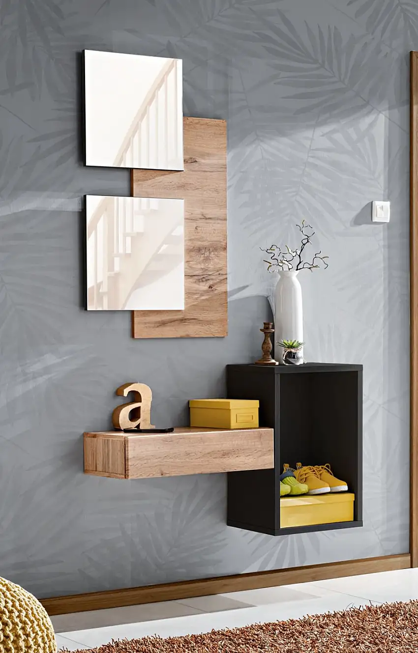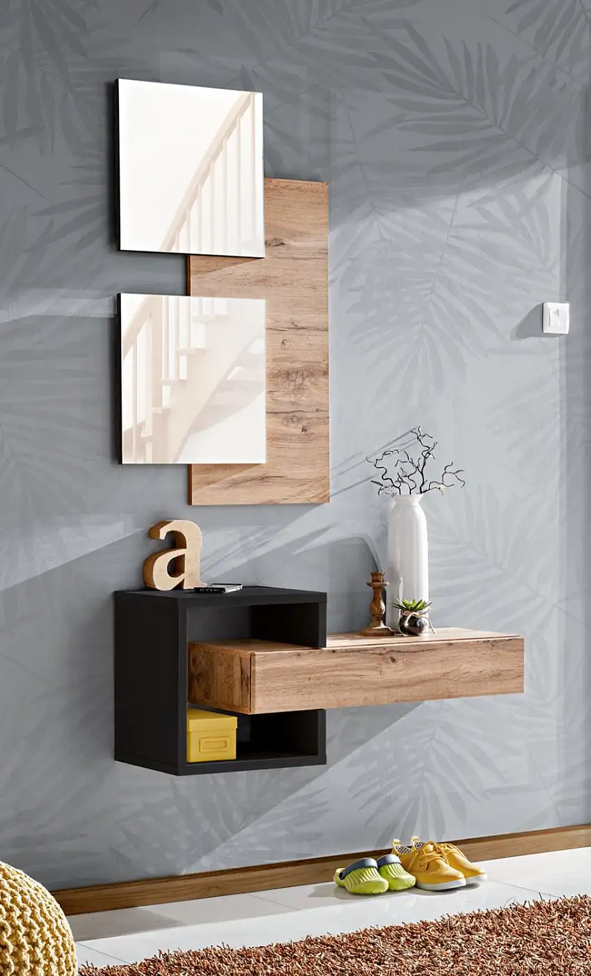 • Garderobe Komplett - Set A Pollestad, 2-teilig, Farbe: Eiche Wotan / Schwarz, zwei Spiegel, eine Wandkonsole mit Schublade, schlichtes und einfaches Design, für den Vorraum