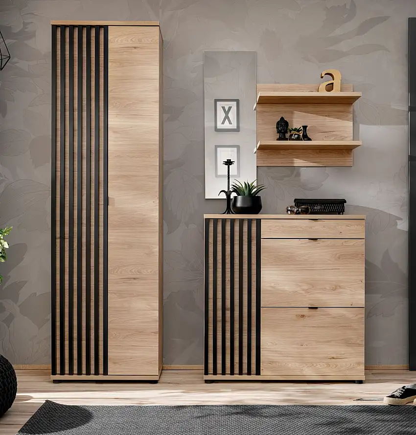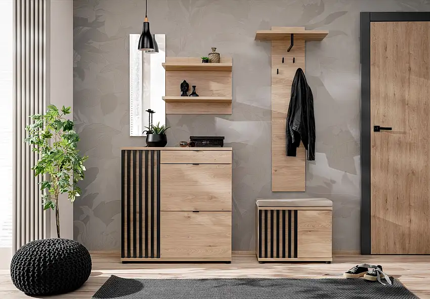 • Garderobe Komplett - Set A Angvik, 4-teilig, Farbe: Eiche / Schwarz, zwei Schuhschränke, inkl. Sitzkissen, vier Haken, Spiegel