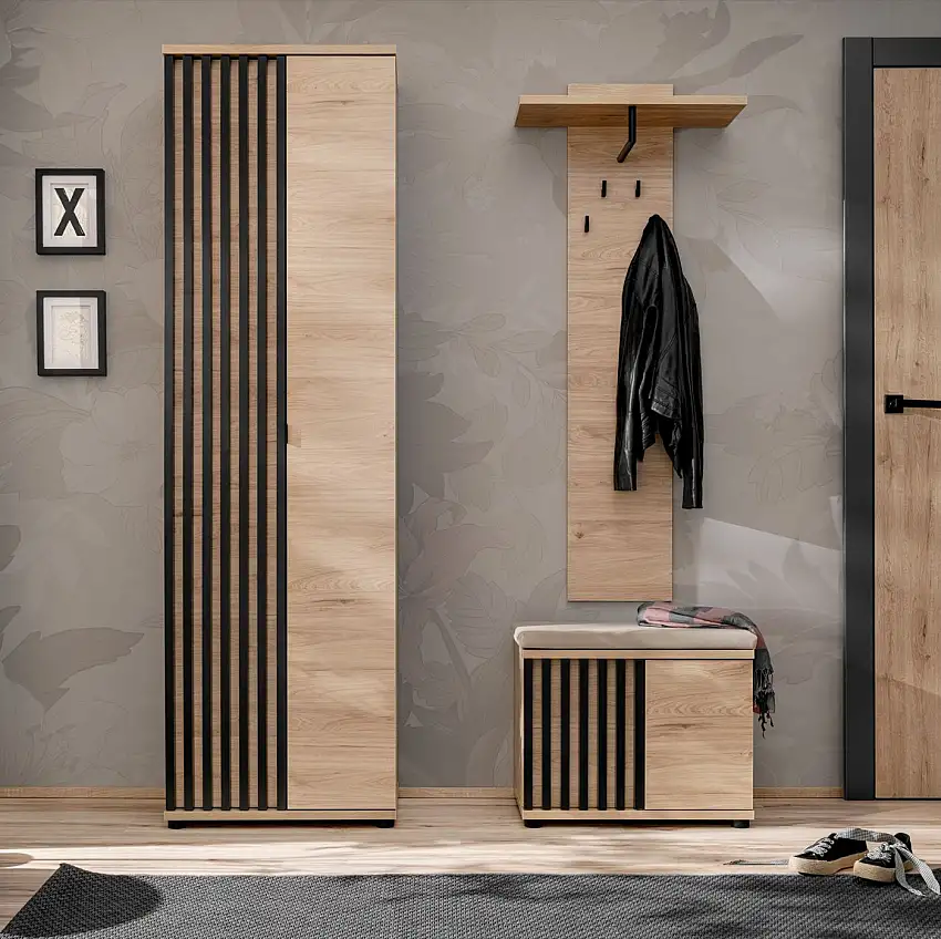 Garderobe Komplett – Set B Angvik, 3-teilig, Farbe: Eiche / Schwarz, ein Garderobenschrank, ein Schuhschrank mit Sitzgelegenheit, vier Haken, inkl. Sitzkissen
