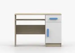 Aktion!1,1 Meter breiter Schreibtisch | blaue Holzgriffe | 1 Schublade | 3 Fächer | 75 x 110 x 50 cm | Weiß / Eiche | Smolikas 75 | 1 Türe