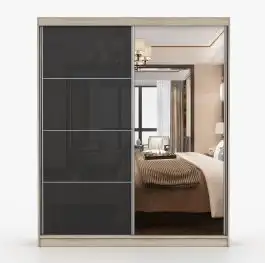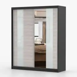 Schiebetürenschrank / Kleiderschrank mit Spiegel | 218 x 183 x 61 cm | Grau-Weiß / Schwarz | Gorski 08 | 2 Türen | 6 Fächer | reichlich Stauraum