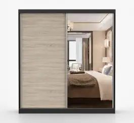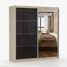 Schiebetürenschrank / Kleiderschrank mit Spiegel | 218 x 203 x 61 cm | Schwarz / Eiche | Gorski 38 | 2 Türen | 6 Fächer | viel Stauraum | eckig