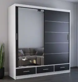 Schiebetürenschrank / Kleiderschrank mit Spiegel | Schwarz / Weiß | Lusatian 24 | 218 x 203 x 61 cm | 3 Schubladen | 12 Fächer | reichlich Stauraum