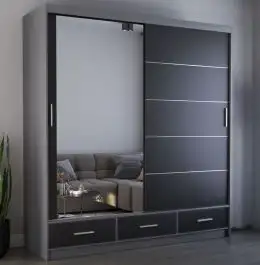 Schiebetürenschrank / Kleiderschrank mit Spiegel | Schwarz / Grau | Lusatian 25 | 218 x 203 x 61 cm | 3 Schubladen | 12 Fächer | Zweifarbig