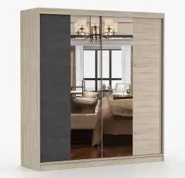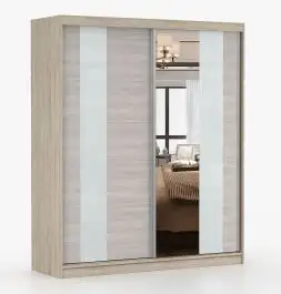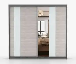 Schiebetürenschrank / Kleiderschrank mit Spiegel | Grau-Weiß / Eiche | Gorski 06 | 218 x 183 x 61 cm | 2 Türen | 6 Fächer | große Kapazität