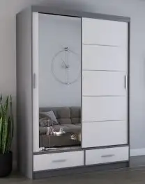 Schiebetürenschrank / Kleiderschrank mit Spiegel | Weiß / Grau | Lusatian 06 | 218 x 150 x 61 cm | 2 Türen | 2 Schubladen | 6 Fächer | viel Stauraum