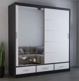 Schiebetürenschrank / Kleiderschrank mit Spiegel | Weiß / Schwarz | Lusatian 20 | 218 x 203 x 61 cm | 3 Schubladen | 12 Fächer | großer Stauraum