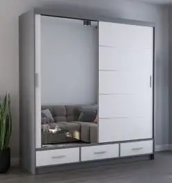 Schiebetürenschrank / Kleiderschrank mit Spiegel | Weiß / Grau | Lusatian 19 | 218 x 203 x 61 cm | 2 Türen | 3 Schubladen | 12 Fächer | eckig