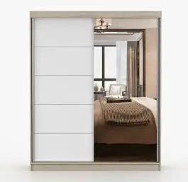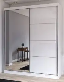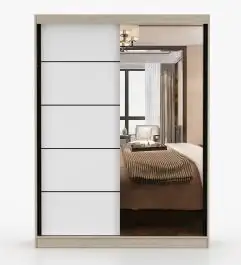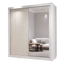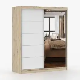 Aktion!Schiebetürenschrank / Kleiderschrank mit Spiegel Weiß / Sonoma Eiche | Bucegi 40 | 200 x 150 x 61 cm | 2 Türen | 6 Fächer | 1 Kleiderstange