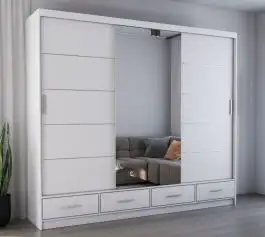 Aktion!Schiebetürenschrank / Kleiderschrank mit Spiegel Weiß | Lusatian 31 | 218 x 250 x 61cm | 3 Türen | 4 Schubladen | 7 Fächer | viel Stauraum | Einfarbig