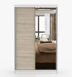 Aktion!Schiebetürenschrank / Kleiderschrank Sonoma Eiche / Weiß | Rudawy 04 | 200 x 120 x 61 cm | 2 Türen | mit Spiegel | 6 Fächer | 1 Kleiderstange